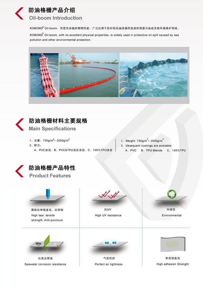 應用于環保及海上作業。材料具有強度高、耐油污、耐海水、抗老化、反復折疊等性能。用于浮子式和充氣式圍油欄均可。